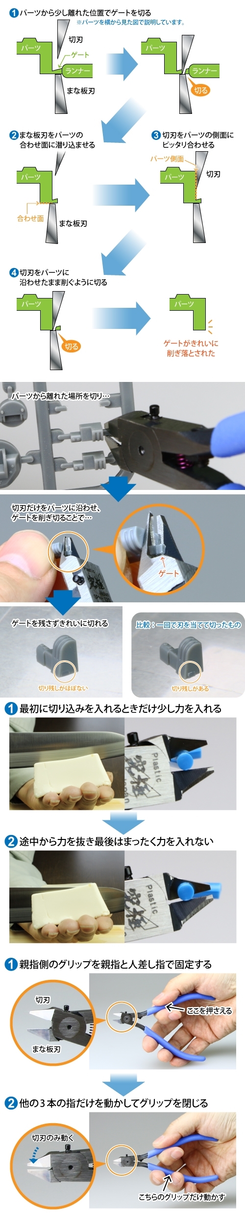 剪切塑料時,只需要在一開始切的那一下,用力握緊把手,切削進去後只需用小小的力量就可以了,一般並不一次直接切斷,正確做法應是稍微留一點頭再磨掉或剪掉。