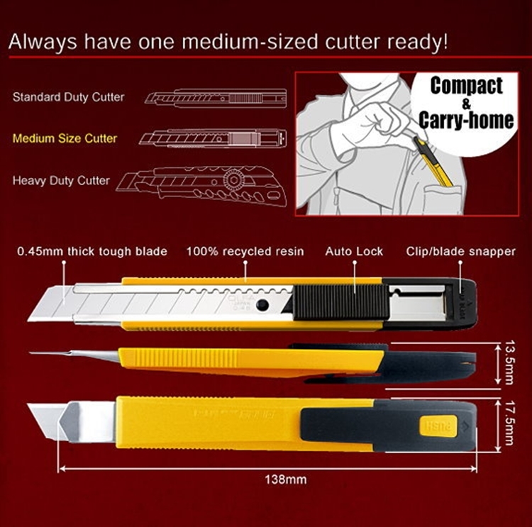 ●左右手皆適用,刀片採用自動卡鎖固定,口袋夾可兼具刀片折斷器功能