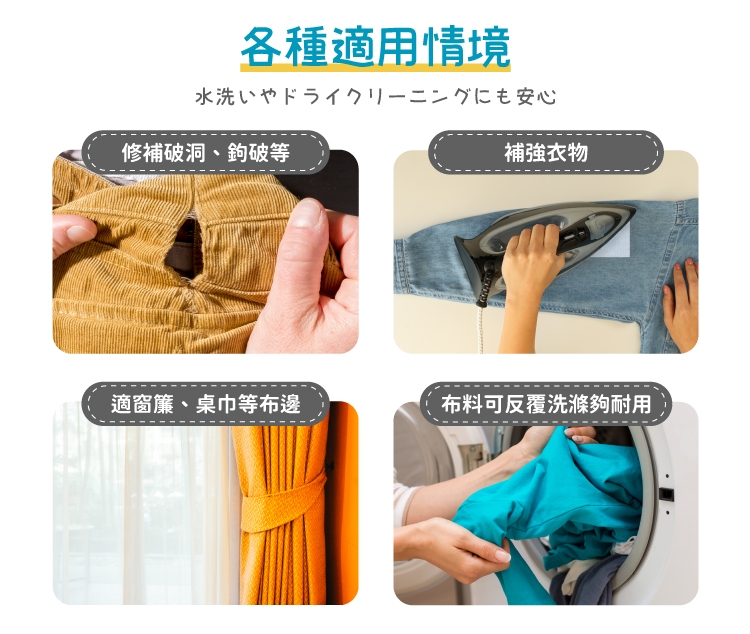 適合裙擺、桌巾、床單...等布邊的長條型修補,將原本因脫線分離的兩塊布重新黏合在一起,可以作為短時間的應急用。