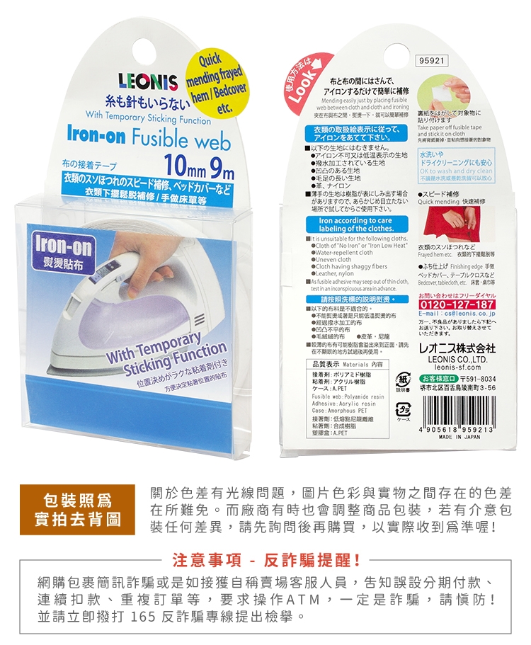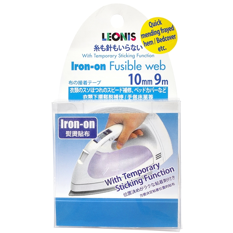 ●【品名】日本製LEONIS衣服褲子破洞修補強化貼燙斗布貼熨斗貼布免車縫貼95921透明無色(寬10mmx長9m)補丁用黏性布粘膠紙布