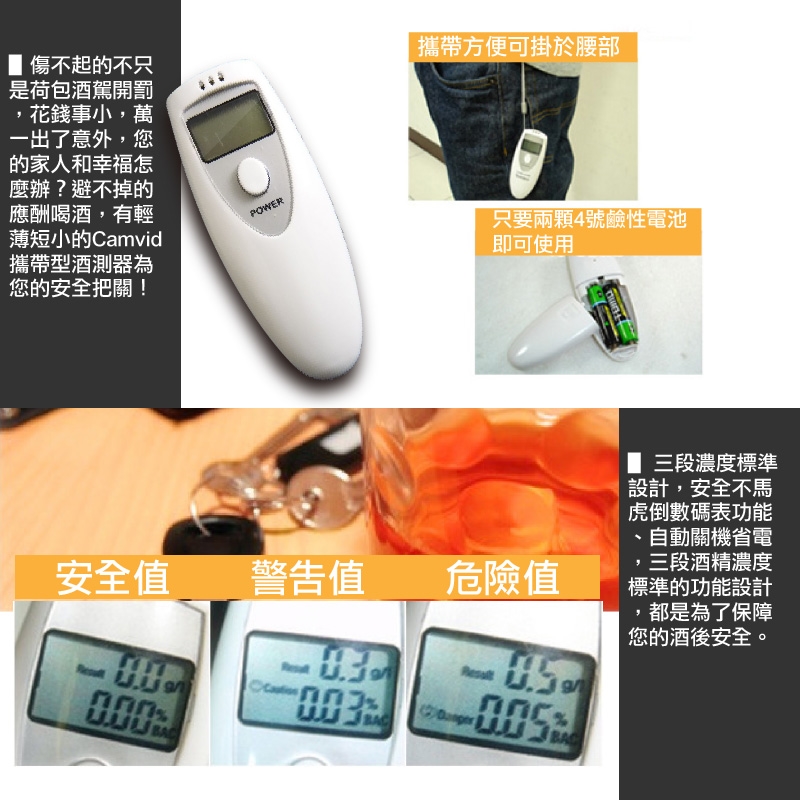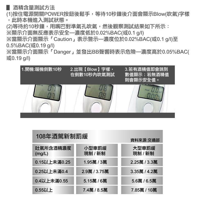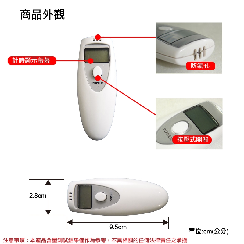1.倒數碼表功能+自動關機省電功能+酒測值數值標準。
