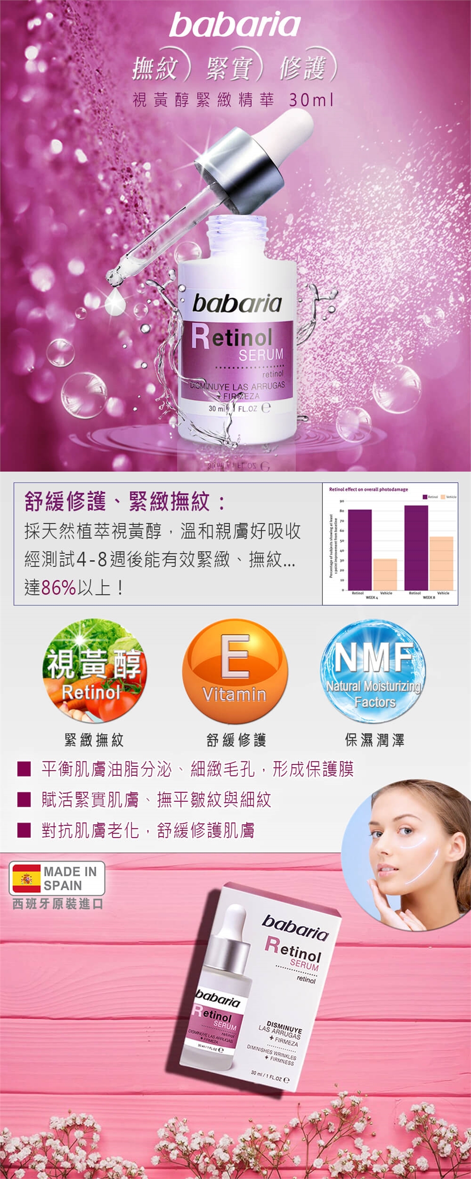 採天然植萃視黃醇,溫和親膚好吸收,經測試4-8週後能有效緊緻、撫紋...達86%以上!