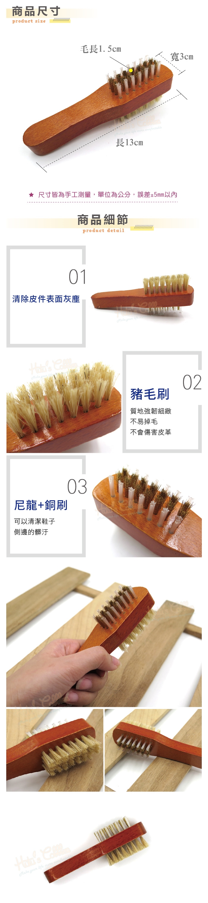 商品詳細介紹 使用方法說明 . 注意事項 最簡易也最完善的保養方式,就是每次穿完以鞋刷均勻刷拭整雙鞋,不讓灰塵有機會附著過夜。若有鞋刷無法處理的污垢,再以麂皮橡皮擦清潔,務必讓愛鞋乾乾淨淨地睡覺。請先於不明顯處試過,確定不會對皮件造成影響再大面積使用。