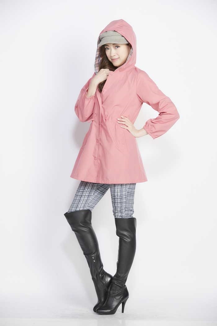 梅紅:連帽設計內裡配格紋,鬆緊束袖口,腰線抽繩呈現曲線。立式斜插口袋。