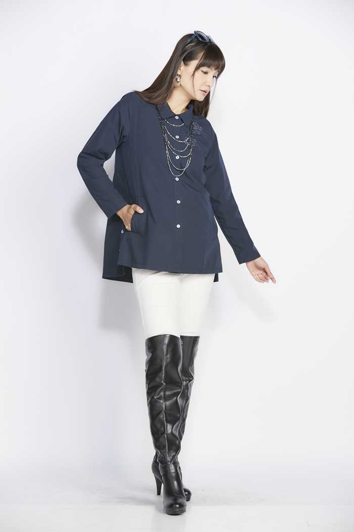 02.此款外套版型部份做A-LINE設計,能大幅度修飾線條,以全開襟設計增加方便穿脫性,並在兩側腰