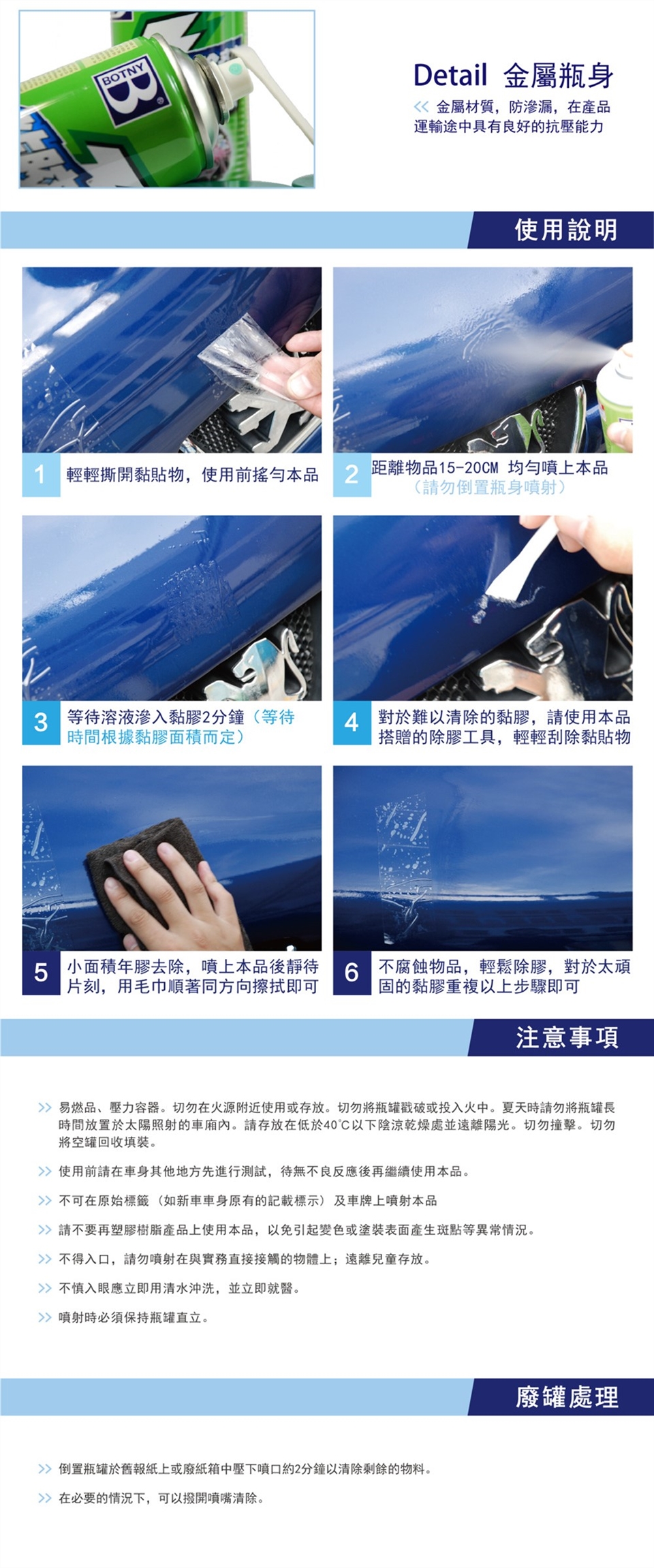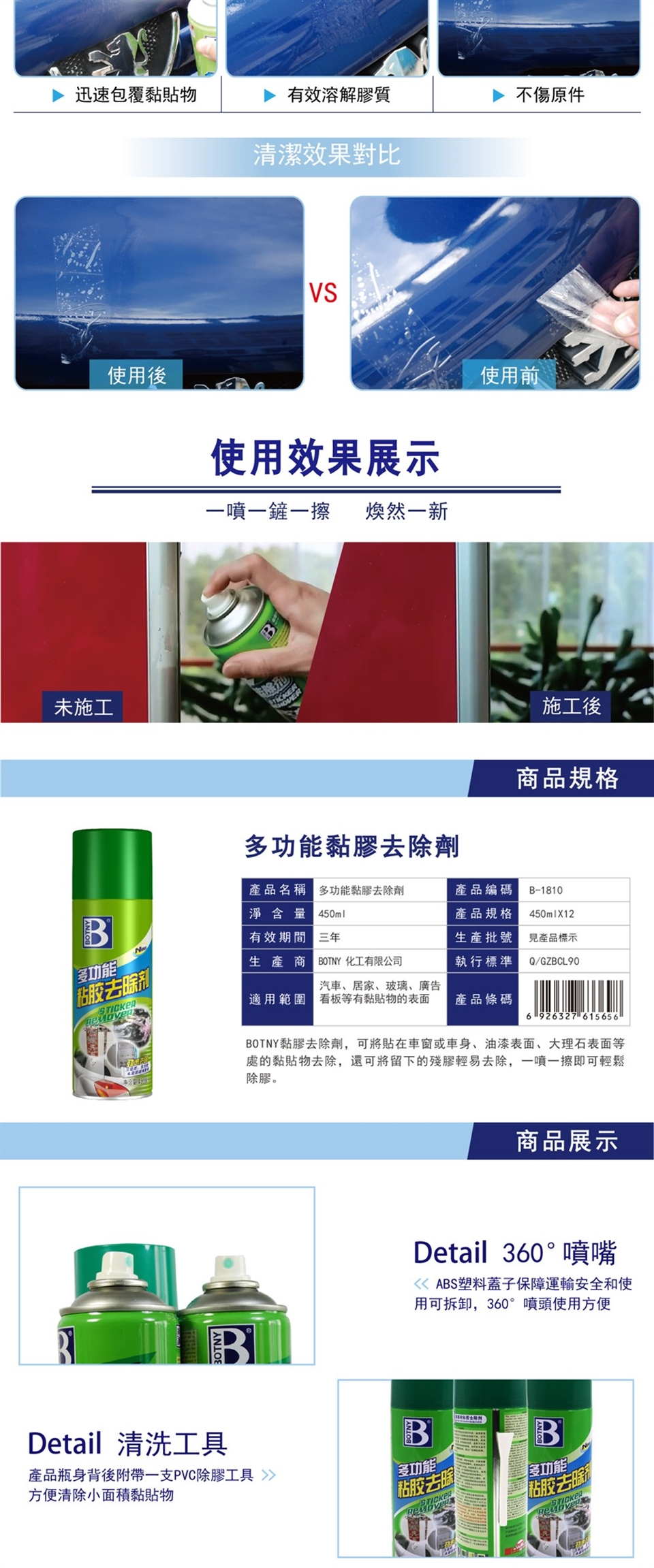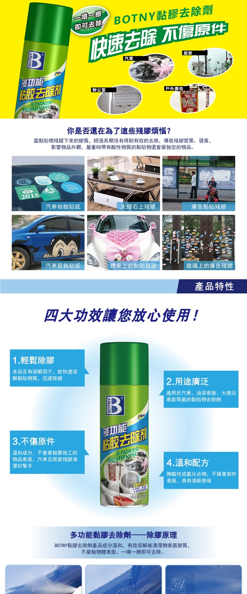 只要一噴一擦,即可輕鬆又快速的自動分解黏貼物底下的黏膠、不乾膠等。