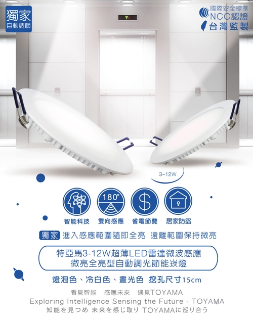 1.TOYAMA特亞馬3轉12W超薄LED雷達微波感應崁燈微亮全亮型緩昇緩降模式更人性化,壽命長,耗電力少,省電又實惠。