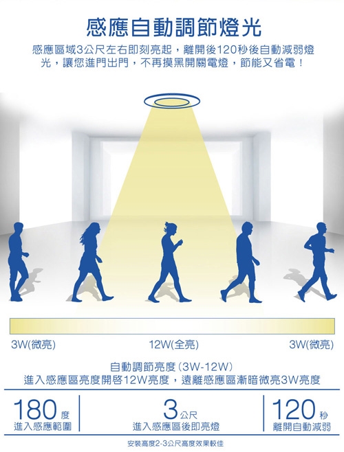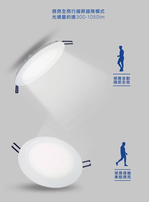 3轉12W超薄LED雷達微波感應崁燈微亮全亮型15cm,天花板崁燈挖孔尺寸15cm,LED感應崁燈微亮全亮緩昇緩降模式更人性化,適用於梯廳、玄關、陽台、樓梯間、走廊、更衣間、廁所與房間角落等,不論是白天或暗夜,會隨著人體或動物移動感應亮燈,人體或動物離開時約120秒自動節能呈現微亮模式。比紅外線感應崁燈靈敏,感應範圍角度約180度(左右各90度),照明角度約160度,且最大感應距離高達3公尺,此範圍內有物體移動會自動亮燈時間約120秒±10秒且照明達1100Lm有效省電節能減碳,是家庭及商業空間角落照明必備品,LED感應崁燈微亮全亮緩昇緩降模式15cm推薦第一首選。