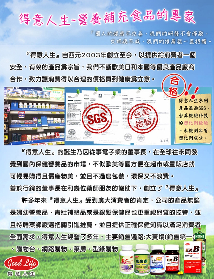 『得意人生』自民國92年創立至今,以提供給消費者一個安全、有效的產品為宗旨,我們不斷洽詢歐美日和本國等優良產品,致力讓消費得以合理的價格買到健康為立意。