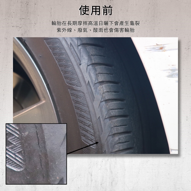 強力保護膜、延長輪胎壽命、活化橡膠膜、抗酸雨、防龜裂、防粉塵、抗紫外線
