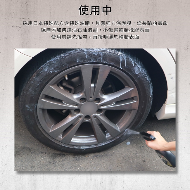 3. 日本新配方,絕無添加柴煤油石油溶劑,不傷害輪胎橡膠表面,請安心使用。