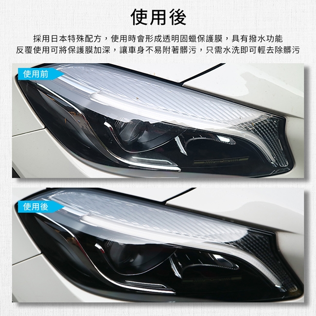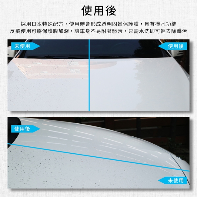 本產品採用日本特殊配方,使用時會形成透明固蠟保護膜,具有撥水功能,表面亮麗光澤。反覆使用可將保護膜加深、增加鮮豔度。讓車身不易附著髒污,只需水洗即可輕鬆讓髒污頑垢一掃而淨。