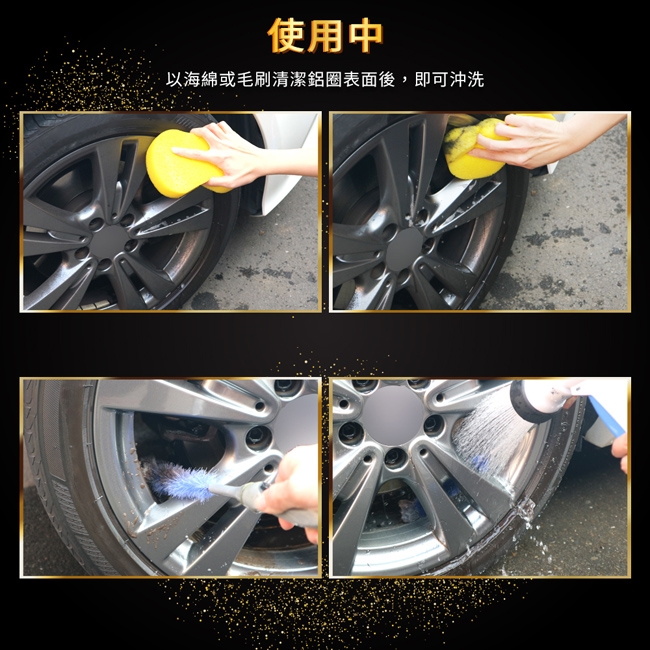 噴灑於鋁圈表面,待泡沫分解1-2分鐘,以海綿或毛刷清潔鋁圈表面,即可沖洗。