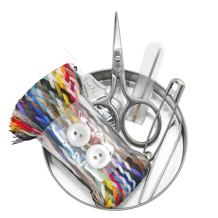 ●【品名】日本製LEONIS鐵罐隨身縫紉針線盒84601針線包(含針、穿線器、剪刀、鑷子、針袋、鈕扣、線、別針...)