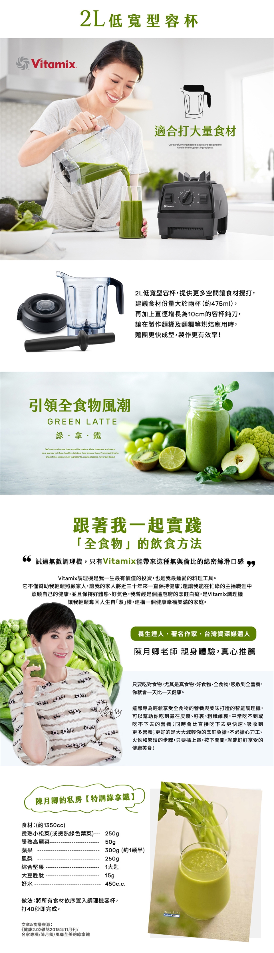 ●知名主持人、暢銷作家、養生達人─陳月卿老師,唯一指定用調理機!親身體驗,誠心推薦。 Vitamix調理機的「黃金組合」能加倍釋放細胞壁中的脂質與植化素,減少微量元素氧化,釋放更多食材美味,試過無數調理機,只有Vitamix能帶來這種無與倫比的綿密絲滑口感,釋放最完整的營養素。