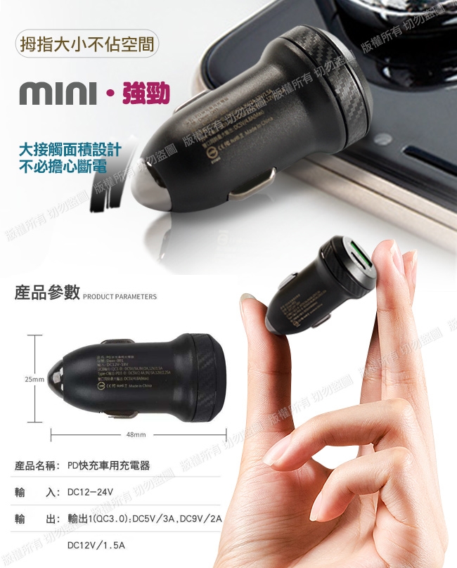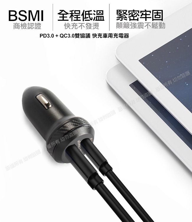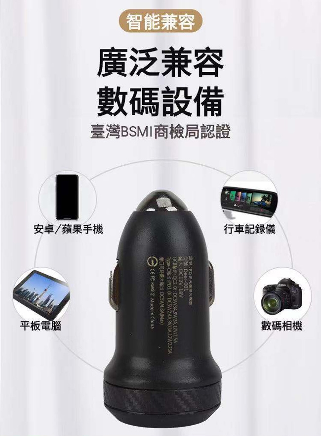 商檢認證 PD+QC3.0 USB 大功率 雙孔超急速車用充電器(BSMI商檢認證)