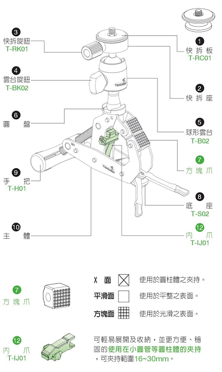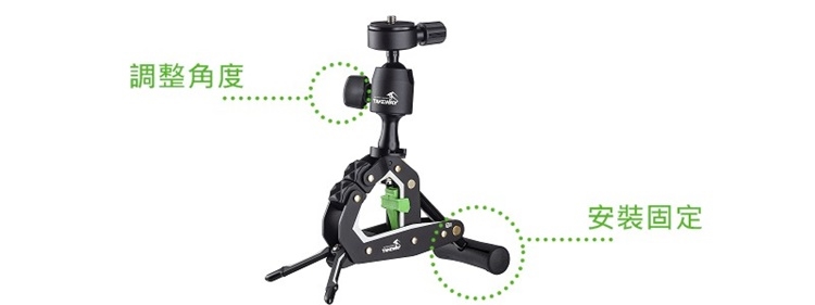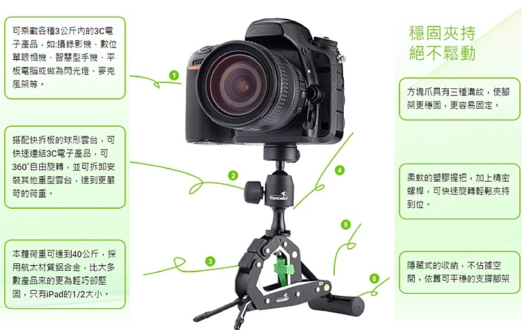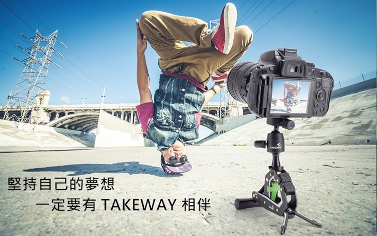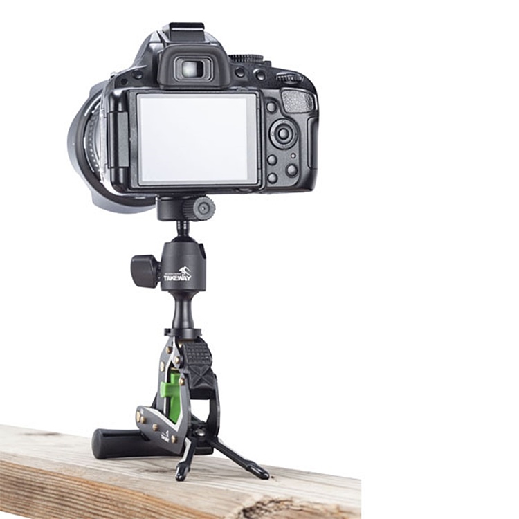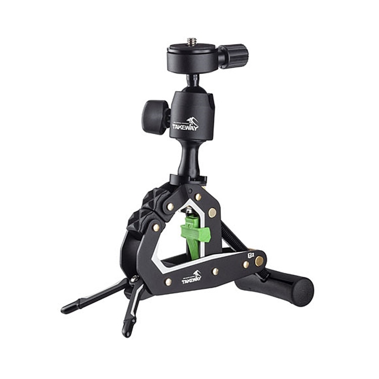 ●【品名】台灣TAKEWAY航太鋁合金鉗式腳架鉗腳架T2(含萬向球型雲台和快拆板)可替代相機三腳架-台灣公司貨1年保固