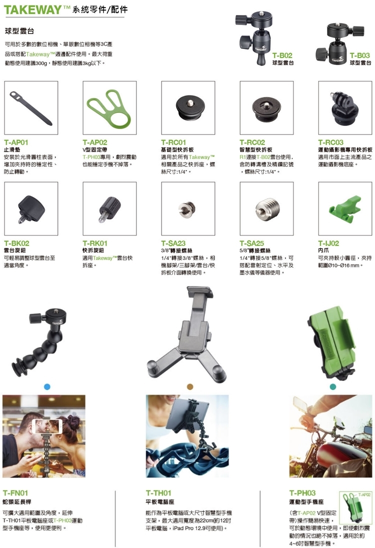 T2 有快拆設計, 採國際通用尺寸: 1/4"螺絲, 市面上大多數的3C產品都可以安裝, 例如: 單眼相機、運動攝影機、錄影機、手機...等, 附件手機座適用尺寸: 4 - 6.7吋 (可另選加購配件 T-TH01平板夾, 適用於大尺寸手機及平板, 最大可用12.9吋 i Pad pro)