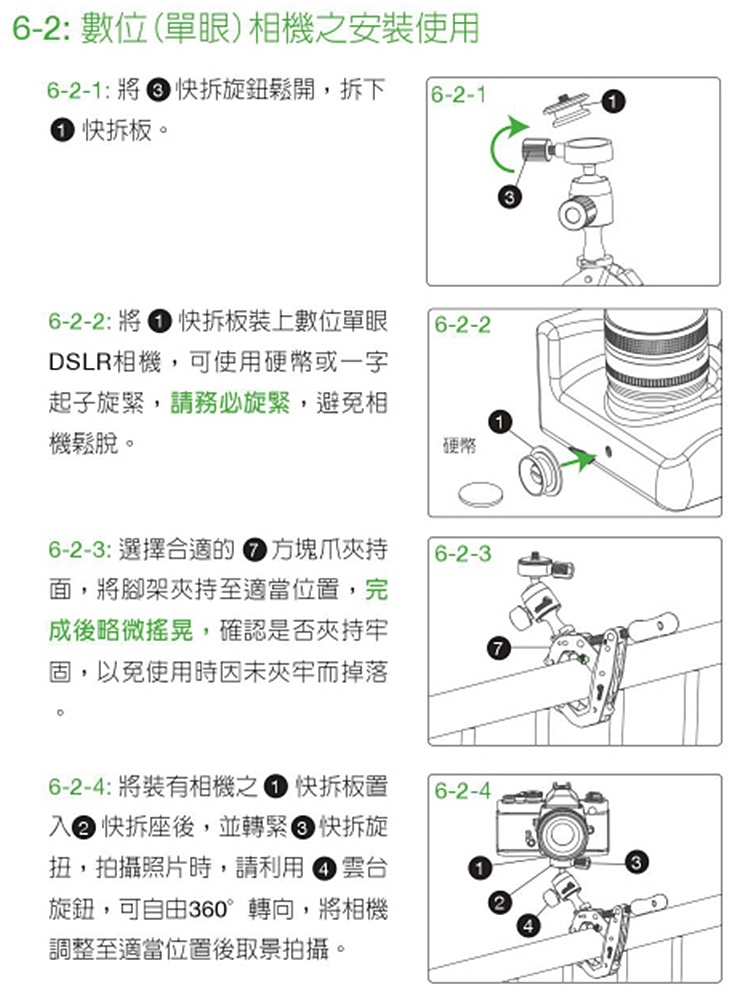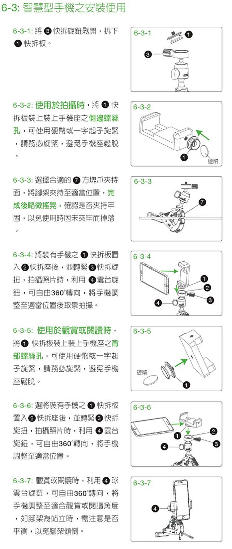 ●搭配快拆板的球形雲台快速連結3C電子產品,360度旋轉,並可拆卸安裝其他雲使用