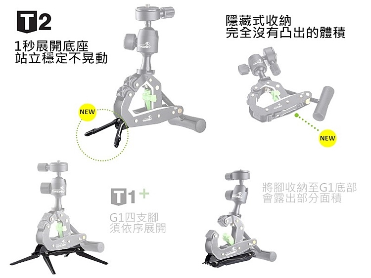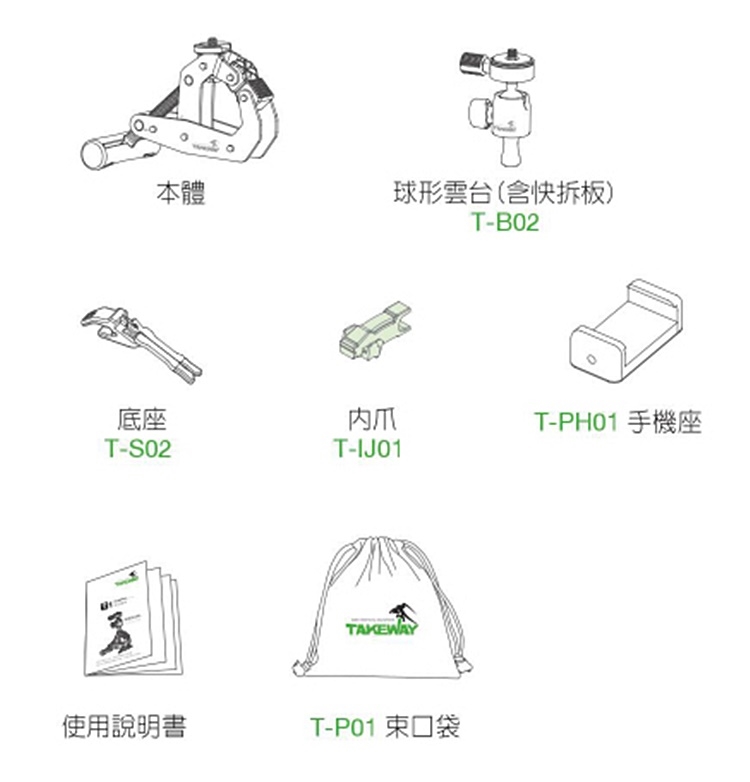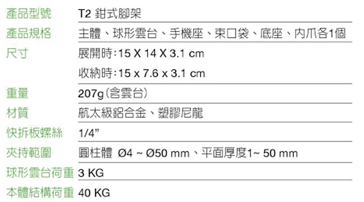 ●【內容】T2本體、球型雲台(含快拆板)、底座、內爪、手機座、說明書、收納袋