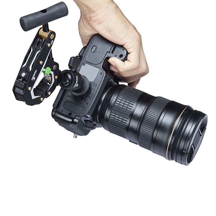 可以! T2夾持主體最高荷重可達40KG,完全不用擔心荷重問題,絕對可以滿足各種大型單眼相機的使用需求!! 若您的單眼相機重量超過3KG可自行將雲台拆卸下, 更換上市面上任何品牌的大型雲台, 部分大型雲台為3/8螺絲孔, 只需搭配2轉3螺絲就可以輕鬆安裝上T2主體了~