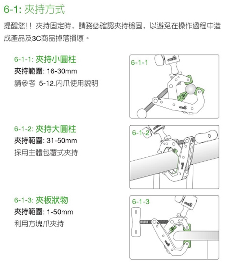 T2的專利設計結構, 除了可以站立還能夾持, 可以固定於生活周遭的物品, 為了提高好用性, 無論大小圓柱或厚薄板可以固定喔! (板狀: 1-50mm, 圓柱: 4-50mm)