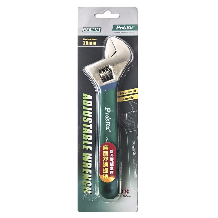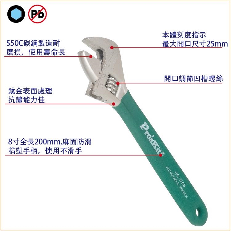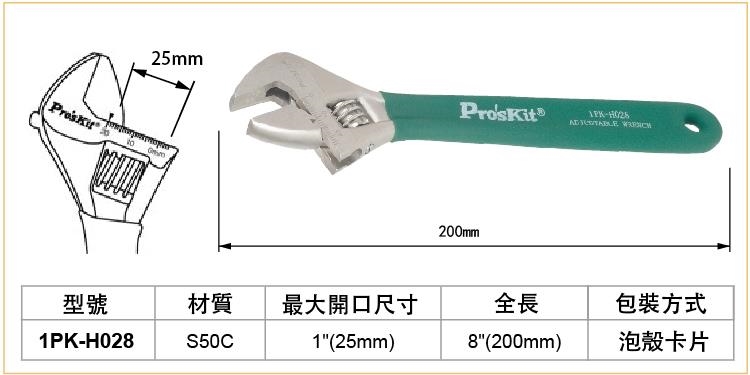●【品名】台灣寶工ProsKit鈦金防鏽麻面防滑8吋活動扳手1PK-H028(最大2.5公分刻度;S50C碳鋼)