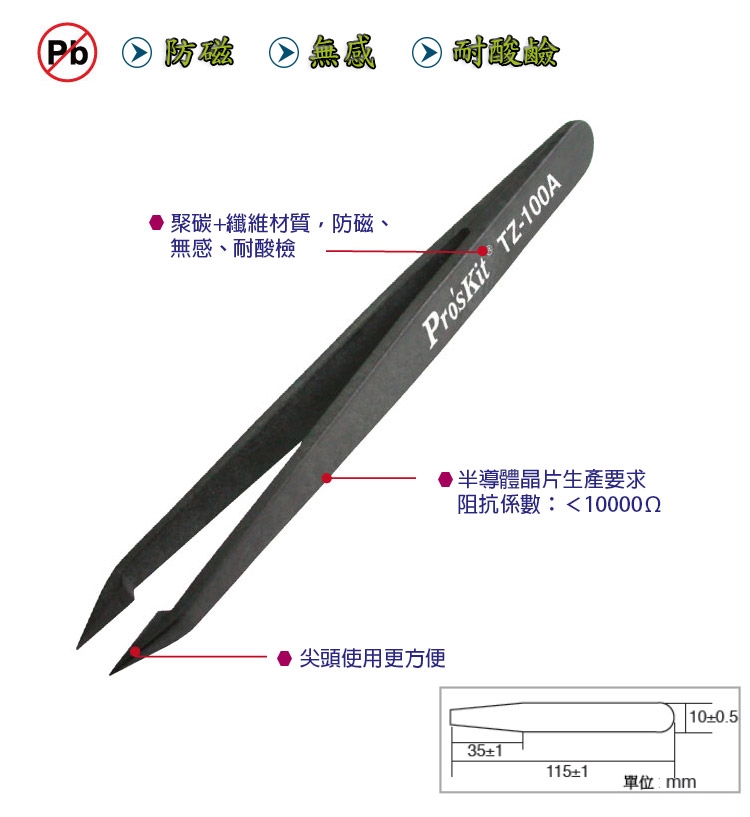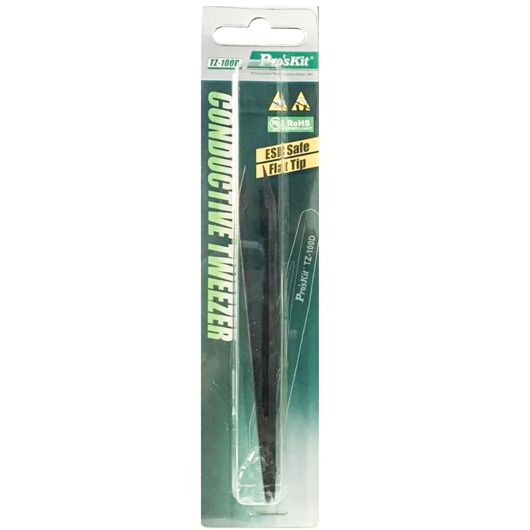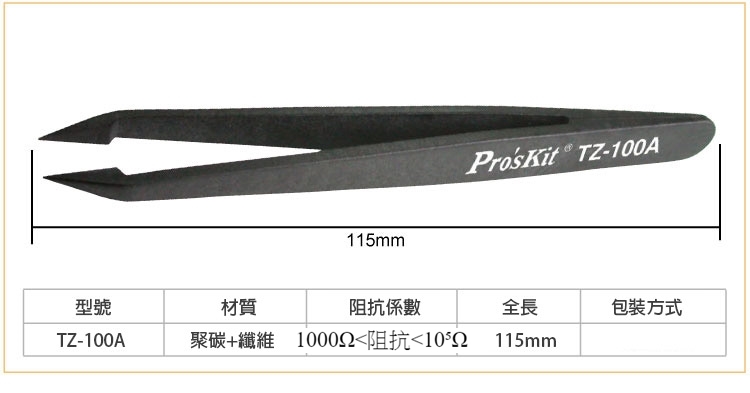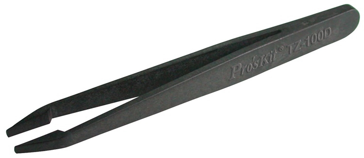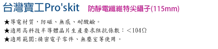 ●【品名】台灣寶工ProsKit防靜電防磁耐酸鹼PC纖維鑷子夾子TZ-100D(平頭;阻抗<10⁵Ω;適晶片精密電子零件、無塵室)