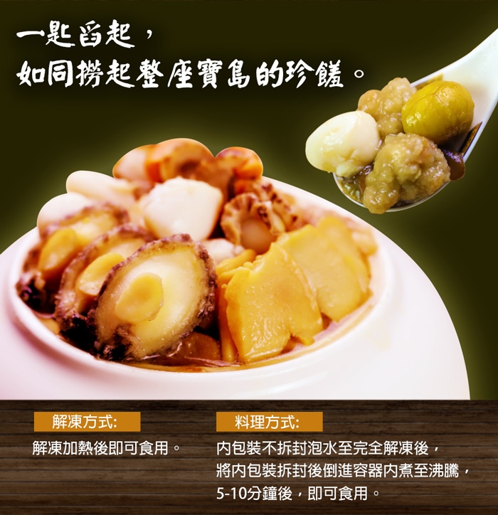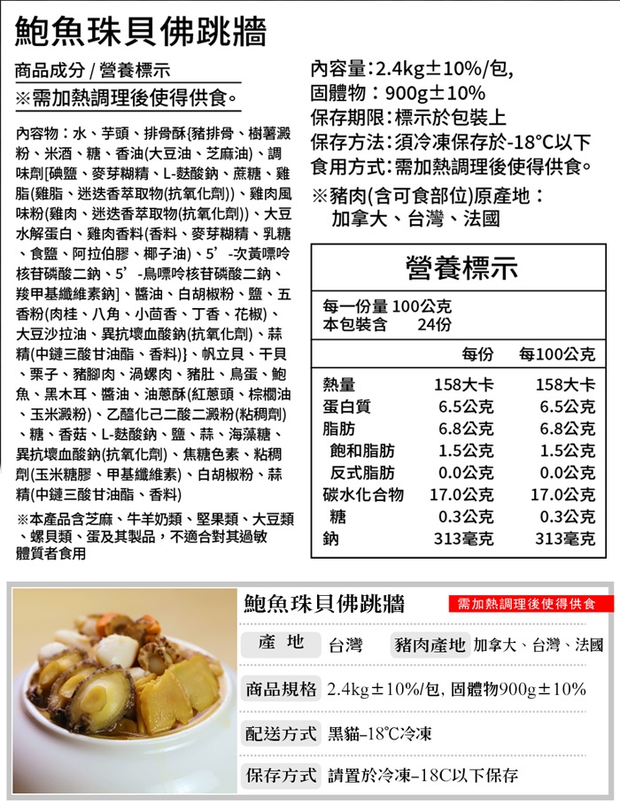 .配送地點限制:限台灣本島,離島不配送br/.訂購注意事項:訂單以實際付款成功時間後五天之內商品會送達,若有指定日期請於訂購時在備註欄備註,以便送達時無誤。br/.退貨限制:本商品無提供體驗,食品一經開封不得退換貨,不接受7天鑑賞期退換貨,除非收到商品如有瑕疵或損毀請先第一時間冷凍保存後,並通知系統後台將於2~3天內完成退換貨作業。br/.注意事項:br/(1)商品內容物以實物為準,商品顏色可能因各顯示器設定而有差異。 br/(2)本商品為食品,基於衛生考量,一經拆封恕無法退貨。 br/(3)商品若於送達時即有損壞,請拍照存證並立即聯絡客服人員。br/.溫馨提醒您,本商品除特別載明為試用品或得試用一定數量外,因涉及食品衛生,不提供試吃,一經拆封即無法退換,敬請見諒。br/1. 接單限制:年菜商品配送限台灣本島,恕無法貨到付款。 br/2. 聯絡資料:請提供2位以上收貨者聯絡電話(第2位聯絡者姓名、市話與手機,請註明收貨人「配送特殊需求」欄位) br/3. 請勿代收:低溫冷凍宅配請勿請管理員代收,配送日當天請保持電話暢通並安排家人配合收貨,以確保品質無虞。 br/4. 訂單修改:訂單成立後恕無法接受地址與配送日期異動。 br/5. 退貨限制:退貨前請確認商品完整不可拆封,並先存於冷凍庫至貨運收貨為止。若一經拆封食用、失溫變質者須償還其價額。 br/※ 產品顏色可能會因網頁呈現與拍攝關係產生色差,圖片僅供參考,商品依實際供貨樣式為準。br/※ 鑑賞期非試吃期收到商品後請立即檢查,若商品有瑕疵狀況,請拍照記錄並於到貨後24小時內以電話或e-mail通知,我們會盡全力協助您處理。br/※ 產品文案為原廠(供應商)所提供,若有變動敬請參照實際商品為準。br/※ 商品不包含配料及其他擺盤裝飾物,實際內容物,請詳閱「商品規格」。br/※ 商品如經拆封、使用、解凍、失溫、或拆解以致缺乏完整性及失去再販售價值時,將影響退貨權益。br/※ 若部分商品為生鮮鮮凍出貨 (例如:魚類/海鮮..等),提醒您需完全加熱熟後食用