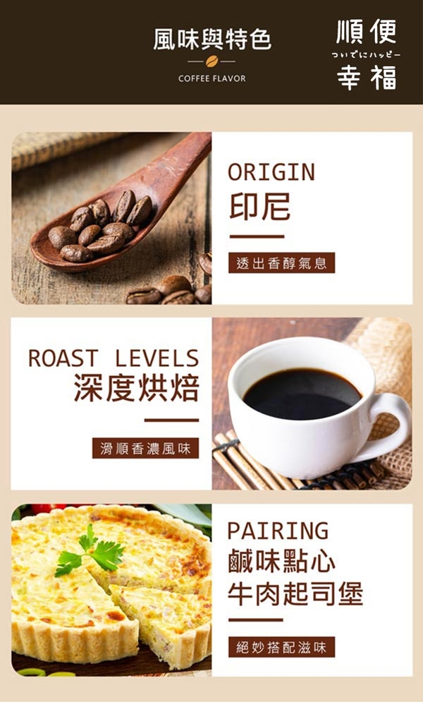 品名:順便幸福-質感單品豆系列-濃醇薰香黃金曼特寧咖啡豆