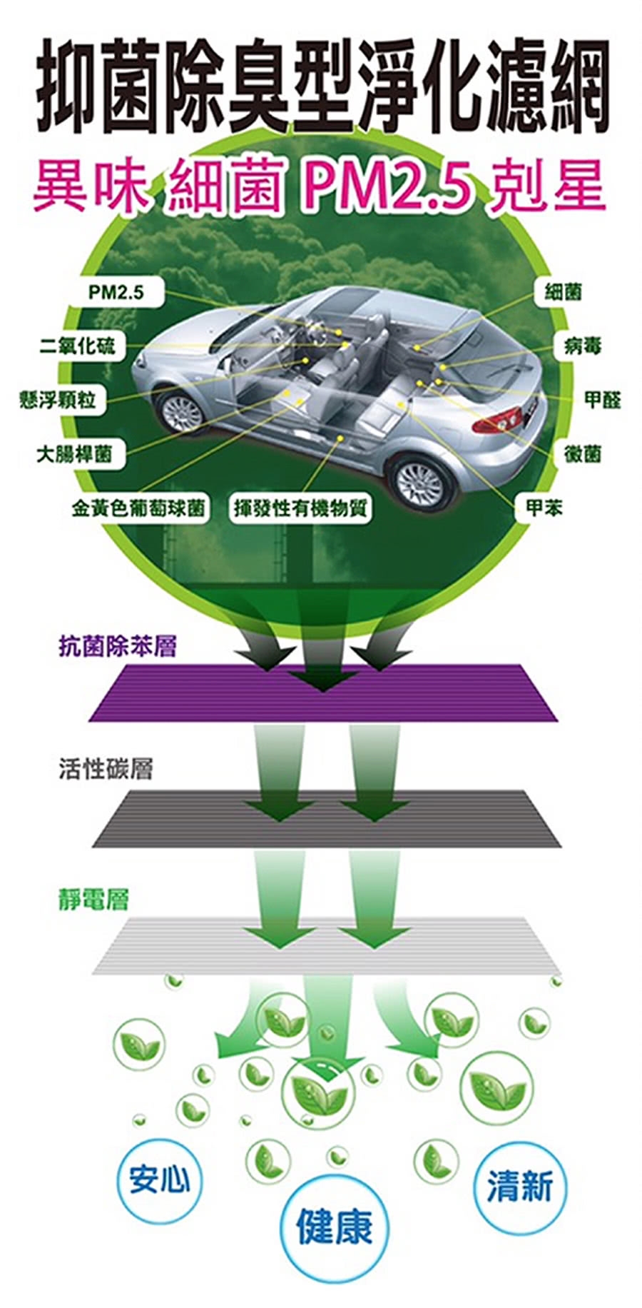 - 阻隔PM2.5、霧霾、殺滅細菌、吸附異味、去除甲醛甲苯、去除汽機車廢氣及二氧化硫。