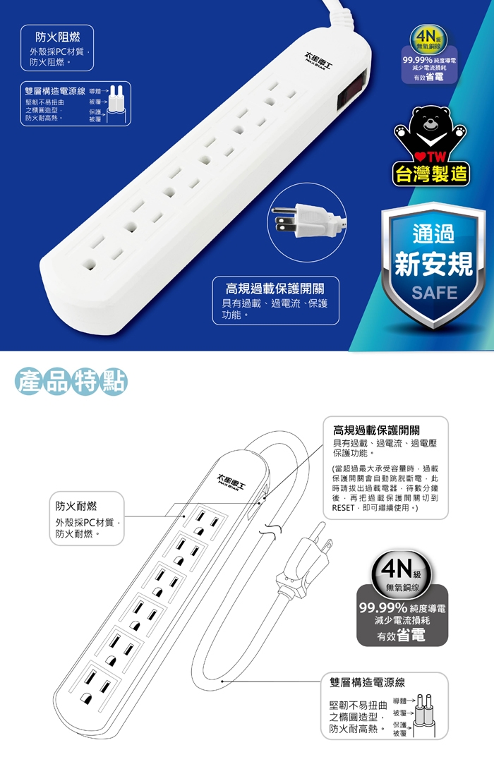 3.雙層構造電源線:堅韌不易扭曲之橢圓造型,防火耐高溫。