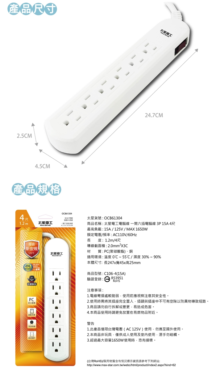 品名:電腦線 一開六插延長線/3P 15A 4尺