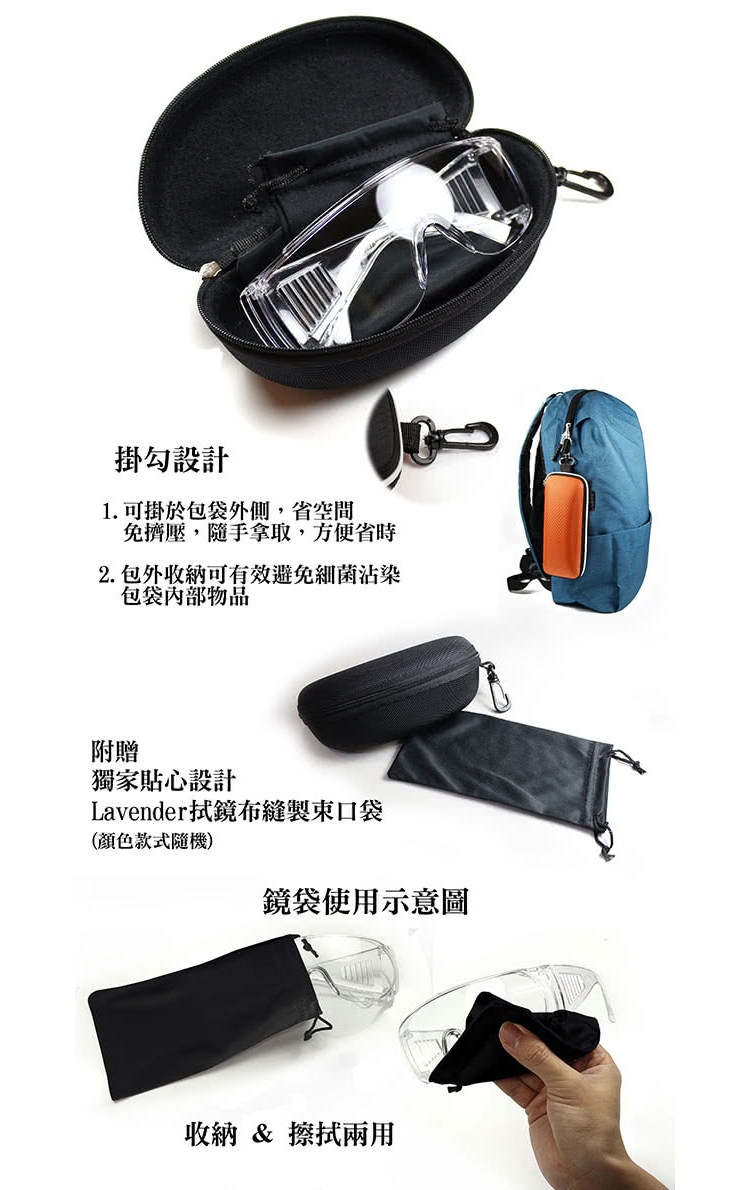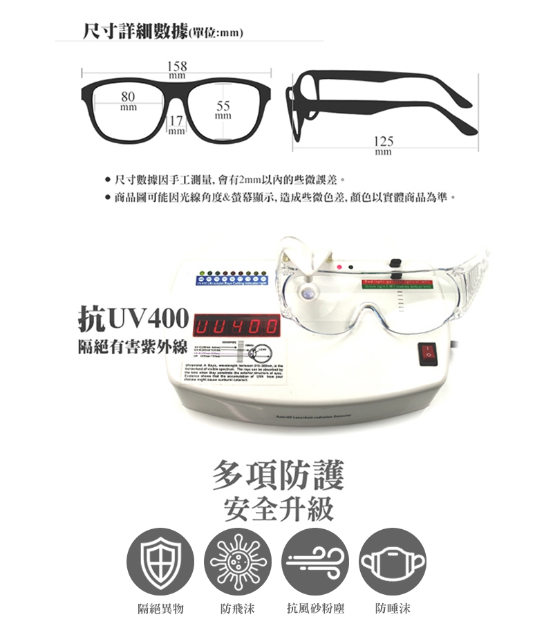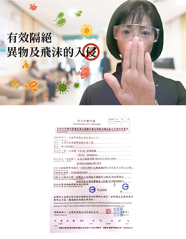 商品詳細介紹 使用方法說明 無 注意事項 1.本產品不適合:(1)用來直視太陽(2)防護人造光源,例:日光浴室(3)防護機械性撞擊使用(4)夜間&昏暗光線駕駛使用2.嚴禁使用有機溶劑消毒,清洗,浸泡此眼鏡