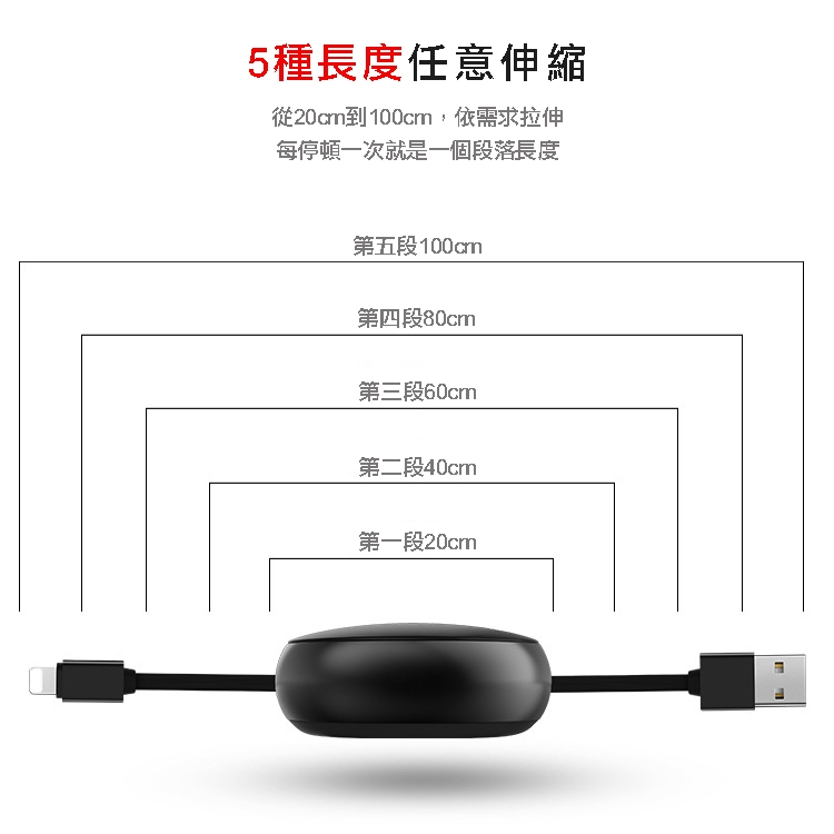 5段伸縮長度,最長可達到100公分,拉到底後自動收回