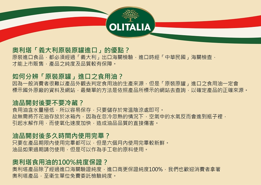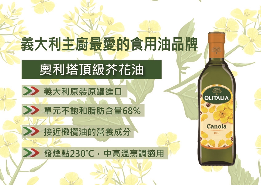 商品詳細介紹 體驗說明 不可體驗 使用方法說明 奧利塔頂級芥花油 使用建議:中、高溫烹調奧利塔特級初榨橄欖油 使用建議:涼拌、中低溫烹調適用 注意事項 保存方法:請貯存於常溫陰涼處,低溫時所呈現混濁狀乃正常現象,請安心使用