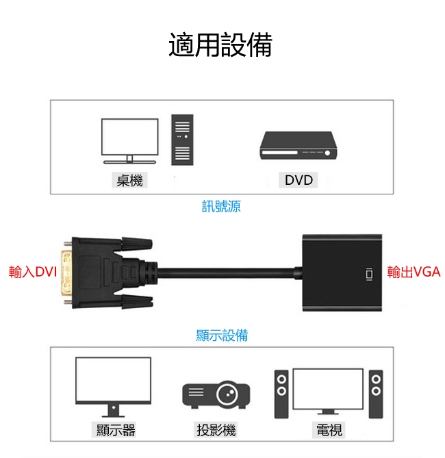 ◆ 適用將DVI訊號轉為VGA訊號之影音電腦設備產品轉換連接使用