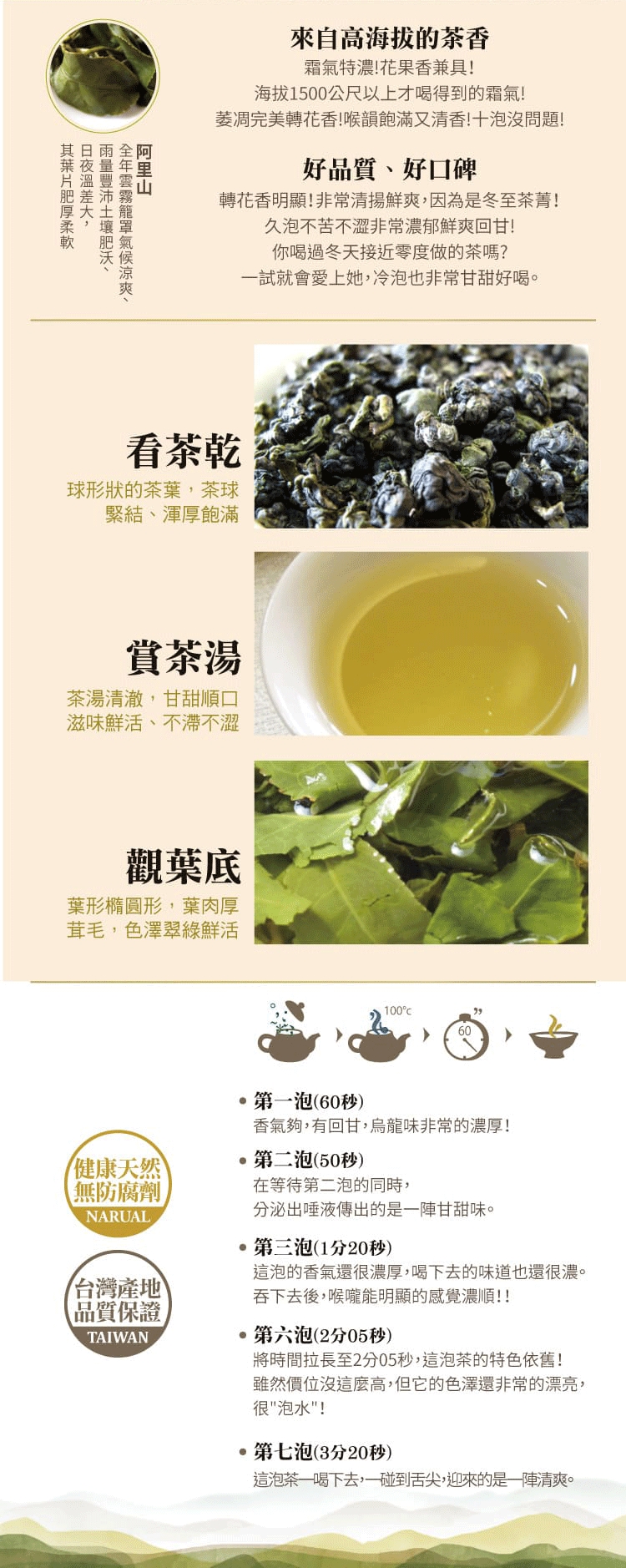 將茶放入茶壺中(茶與比例約1:40),注入100度的沸水,先溫壺(洗查)2~3秒更能揚香,第一泡60秒後出水鮮爽回甘,超好喝!