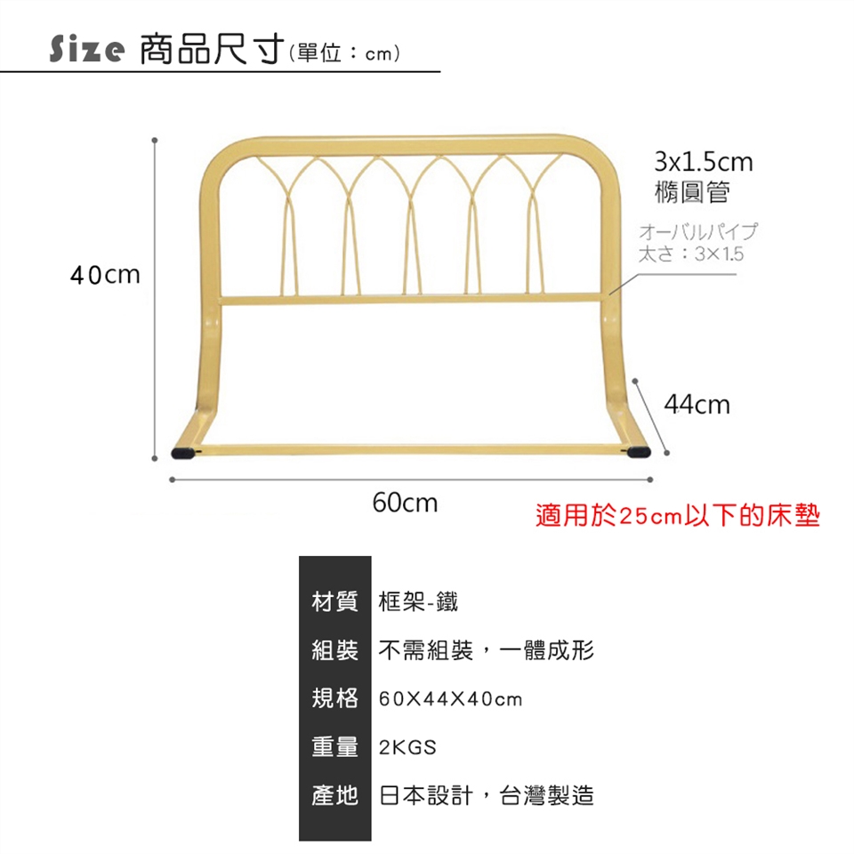 若床墊厚度高於25公分可至賣場挑選60公分床邊護欄。