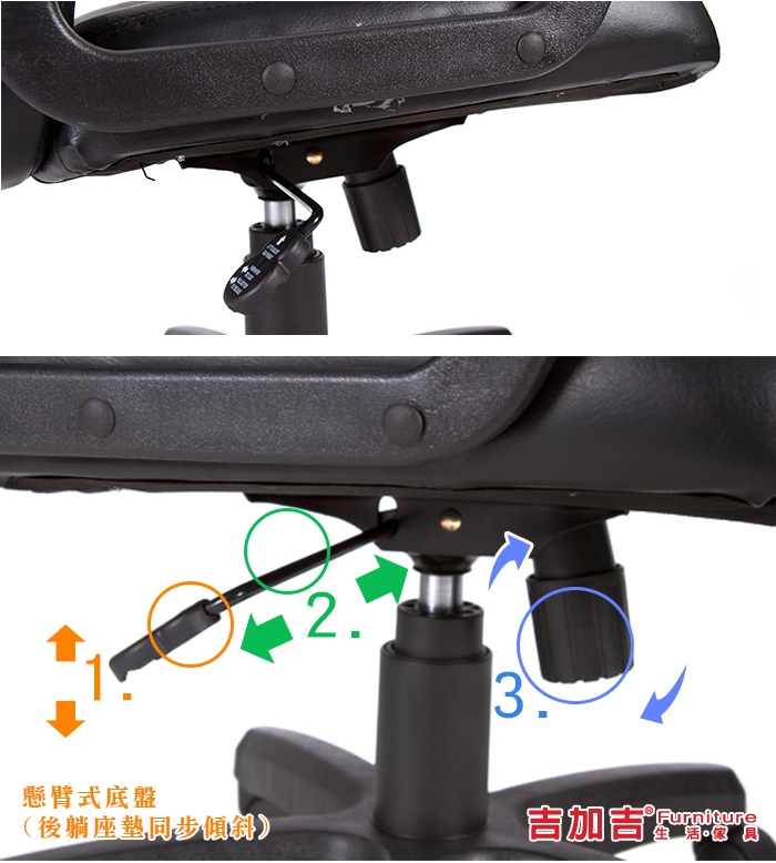 3.後躺鬆緊度:透過坐墊下『轉杯』,旋轉調整,可讓後躺鬆緊不用麼費力,或是增加緊度,不讓後躺速度那麼快。