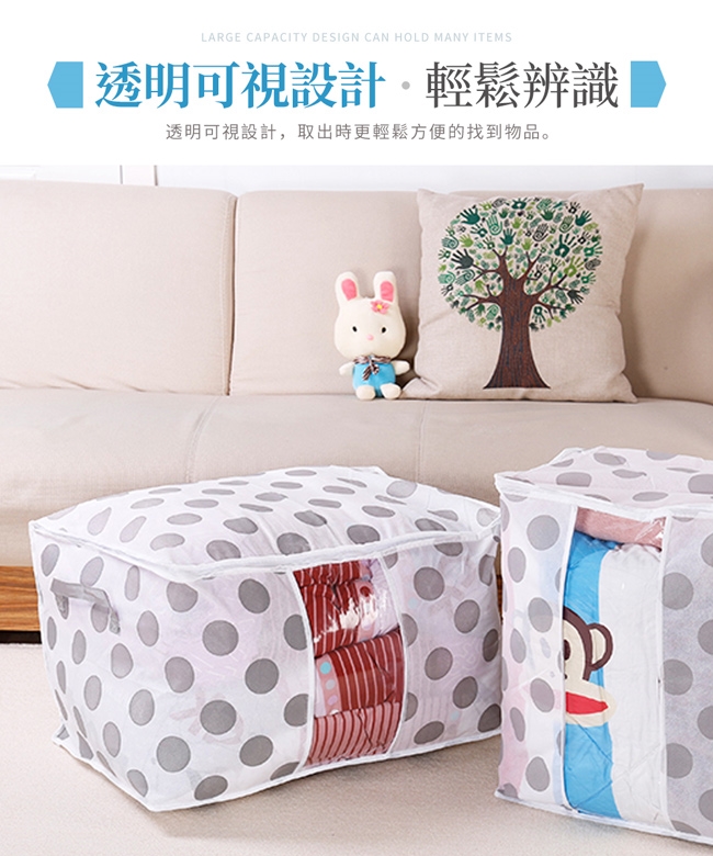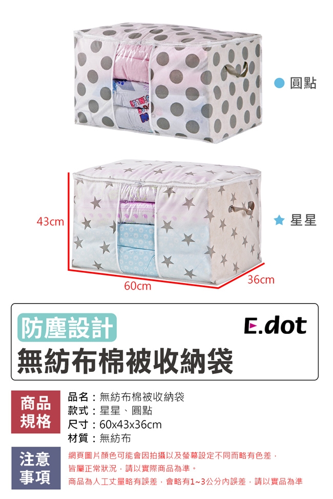 商品詳細介紹 使用方法說明 不需組合 注意事項 ◆ 商品名稱:無紡布棉被收納袋br/◆ 內容物:棉被收納袋x1br/◆ 款式:星星、圓點br/◆ 尺寸:60x43x36cmbr/◆ 材質:無紡布br/◆ 網頁圖片因拍攝關係會與實際商品略有色差,圖片僅供參考,顏色請以實際收到商品為準。