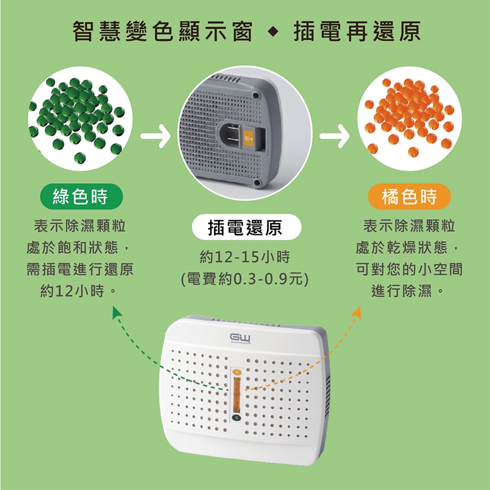 2.首次使用時,請先查看顯示窗的吸濕顆粒若呈現綠色,請先插電12~15小時還原成橘色後,即可使用。