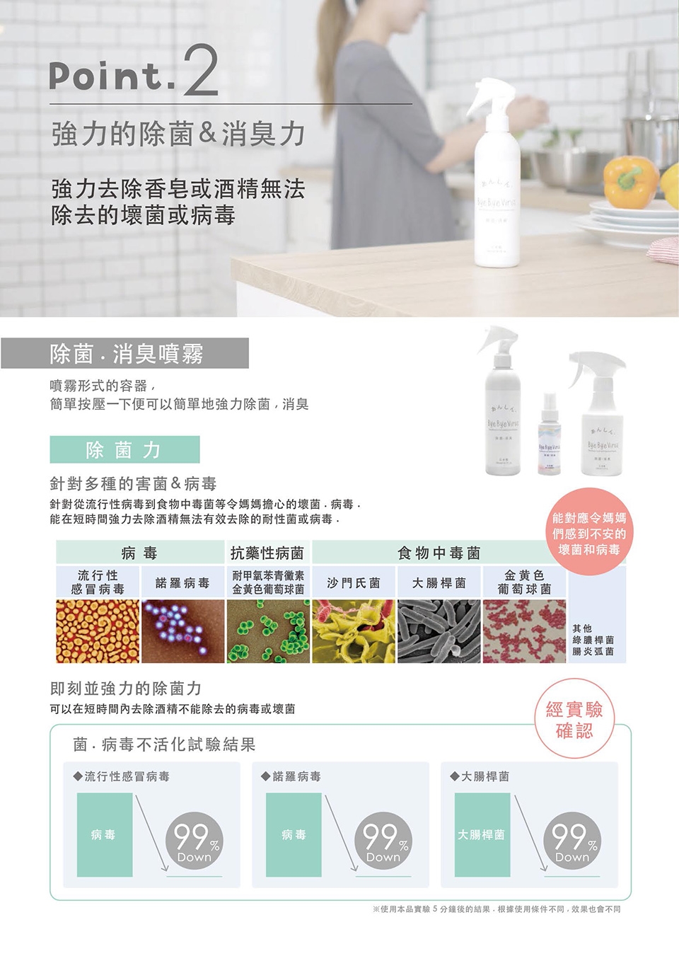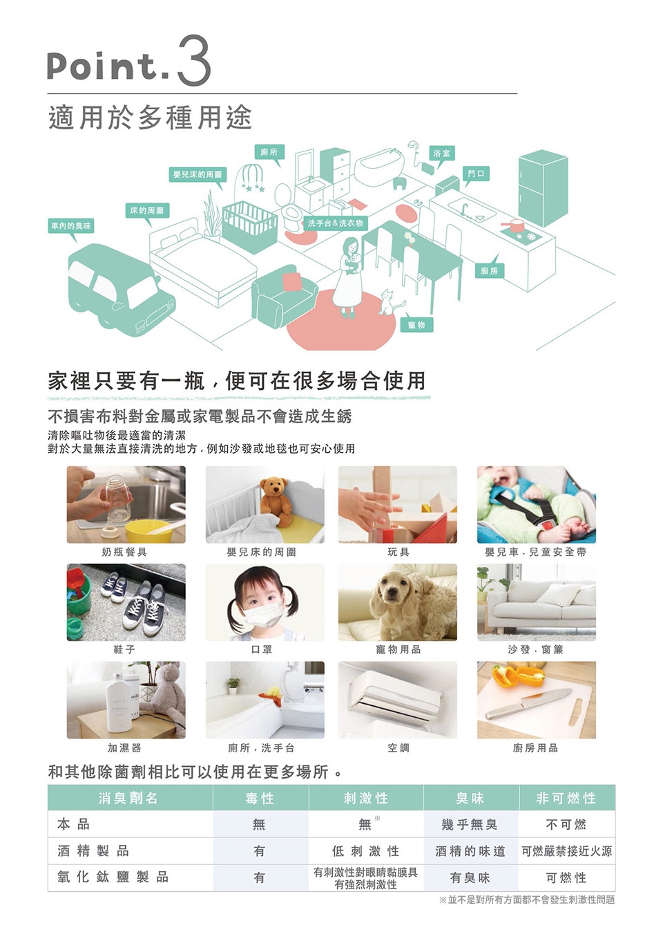 噴霧瓶與補充瓶皆為相同濃度消臭液,補充瓶可直接分裝於自有容器方便外出使用,用於手部、環境消毒時無須稀釋