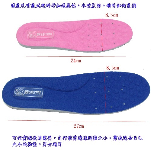 女(粉色) / 長24cm±5%*寬8.5cm*厚10mm(附腳型尺寸裁切線)。