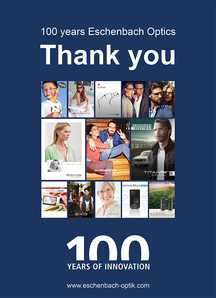 德國Eschenbach光學成立於西元1913年,為領先全球的視力輔具德國製造商,致力於設計與生產高品質的閱讀用放大鏡、工作用放大鏡、放大眼鏡、老花眼鏡、濾光眼鏡、電子擴視機等,擁有各種光學尖端專利技術與專業人才。