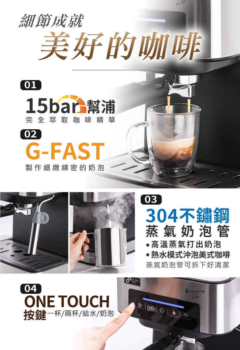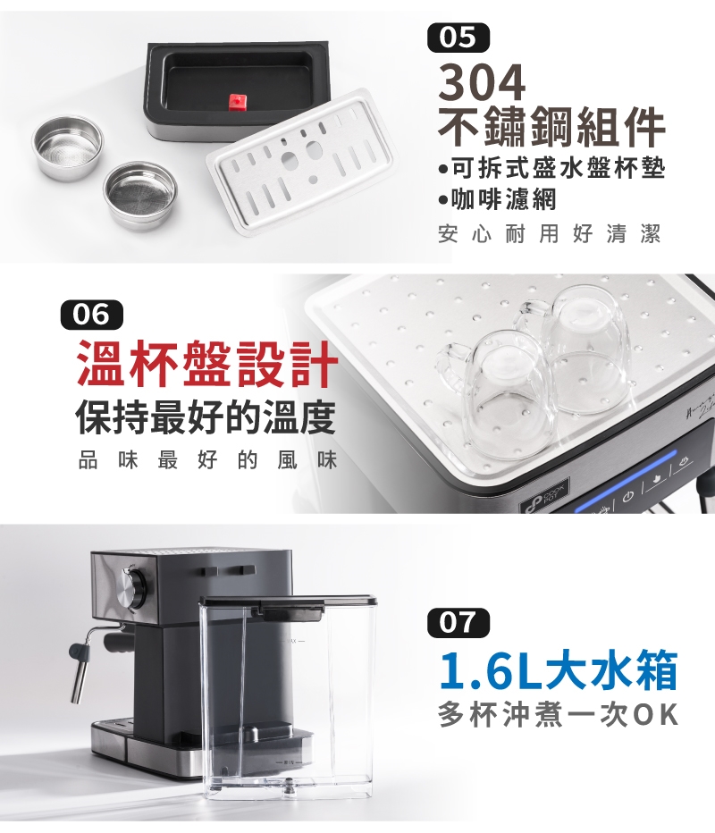 材質:濾網、蒸氣奶泡管、盛水盤杯墊/304不鏽鋼