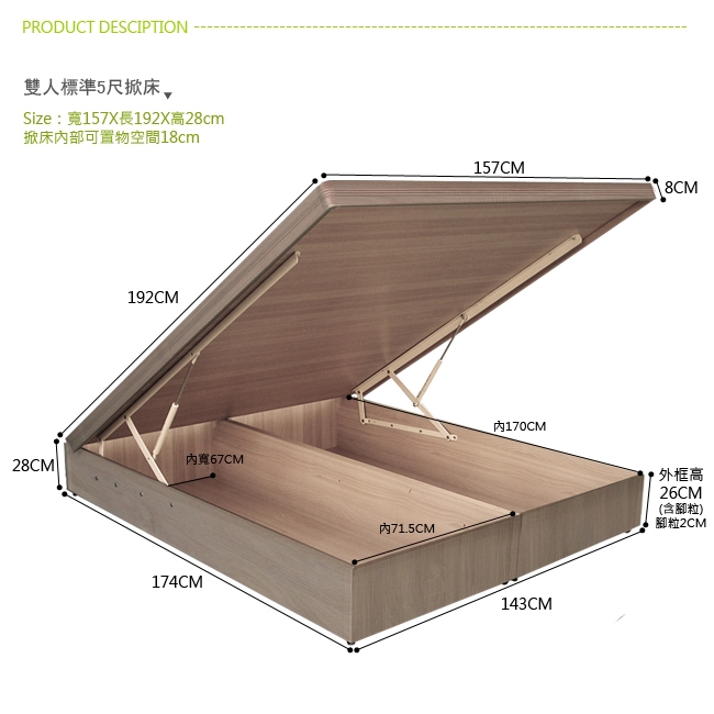 【Maslow-北歐灰橡】雙人5尺F3低甲醛掀床-全通路首創低甲醛灰橡色系掀床,F3環保健康板材,為您的身體著想,請選購最安全、認證過的掀床架,獨特的天然木紋質感,彷彿置身於大自然之間。而此款設計特別適合居住空間狹小沒有多餘置物空間的消費者所設計的掀床架,總高度為28公分,實際內部置物空間的高度約18-19公分,可容納冬夏交替衣物、棉被、鞋盒等用品,不用擔心到處堆疊的收納櫃所造成空間的浪費;掀床架主結構底框採用進口高級的六分木心板材質,堅固耐用;床板側邊採用特殊寬版造型設計,不用擔心床墊滑動的問題;上層層板採用6分木心夾板,可直接放置薄墊平鋪使用或放置床墊組合,不同擔心板材劣質,而有崩塌的問題;專利設計的氣壓棒,不僅開關容易更經過萬次的壓力測試,品質有保障,且商品配送均由專人到府組裝,不用擔心安裝的問題。
