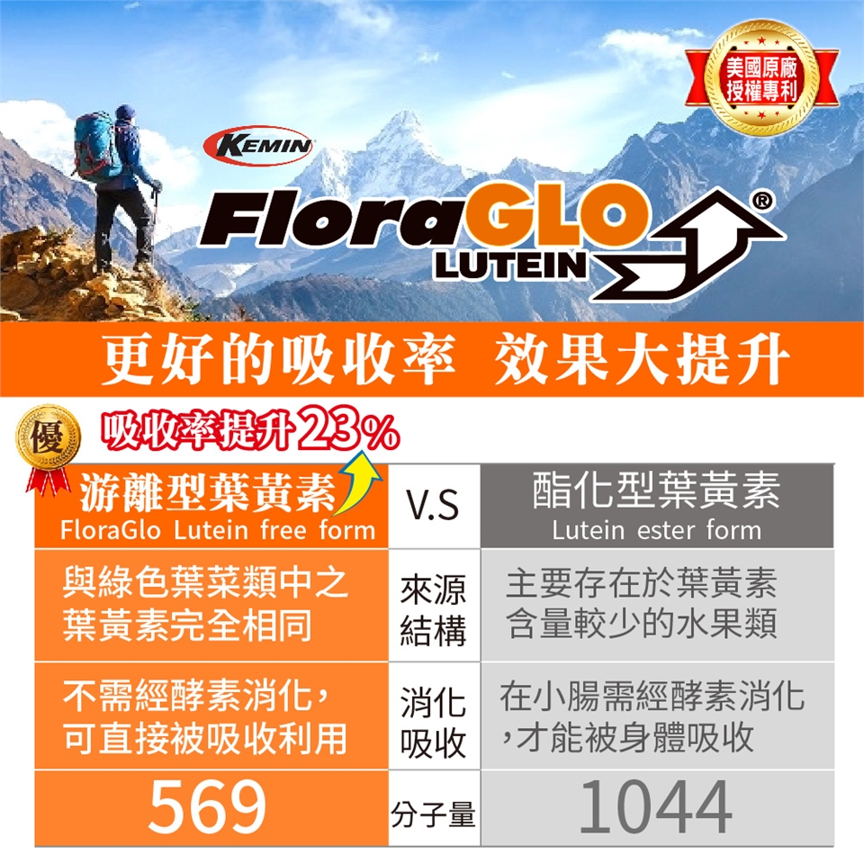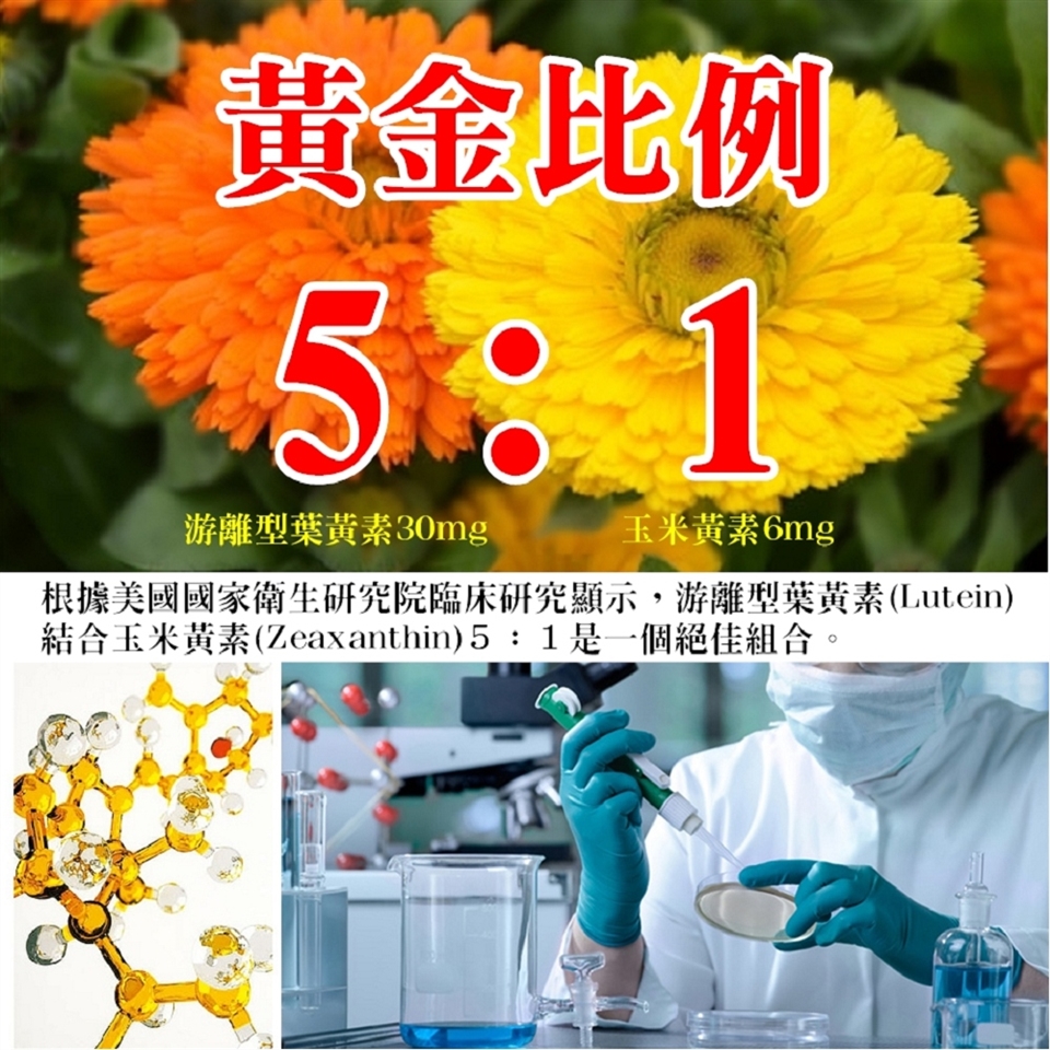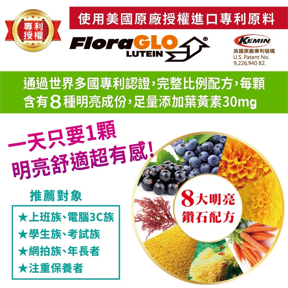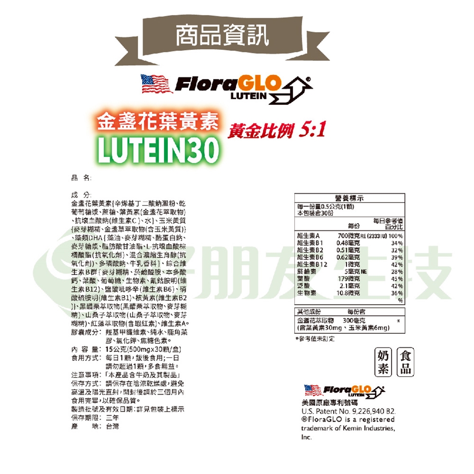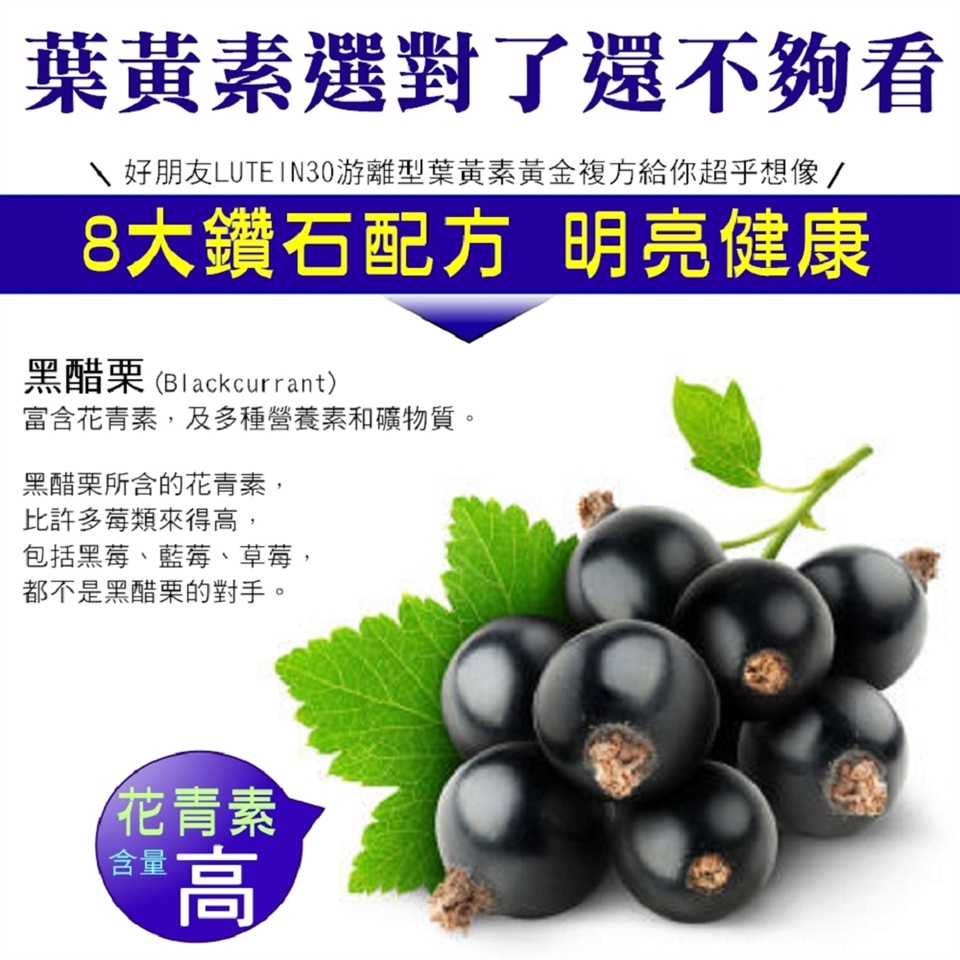 【商品特色】 LUTEIN30採用美國國衛院的黃金比例5:1 (游離型葉黃素30mg:玉米黃素6mg) 足量添加葉黃素30mg,一天只需一顆,即達專業保健效果,有別於一般市售葉素黃僅少量添加5mg或10mg,一次必需吃3-6顆才有相同保健作用。本產品特別採用素食膠囊,讓素食的朋友也能安心食用。 8大明亮鑽石配方《健康舒適 明亮有神》 ★1游離型葉黃素30mg:使用美國KEMIN原廠授權原料,通過世界多國專利認證,獨特萃取製程能維持 葉黃素結構的完整度,食用安全性高。 ★2.玉米黃素6mg:對於晶亮保健有重要功能。 ★3.維生素A:有助於維持在暗處的視覺。 ★4.山桑子:又稱歐洲藍莓,富含高單位之花青素及多種植物多酚,常被飛行員用於保養使用, 對於晶亮保健有極大幫助。 ★5.黑醋栗:含花青素,營養價值高。 ★6.美國進口海藻萃取DHA:富含omega-3多元不飽和脂肪酸的天然海藻DHA,是孕哺乳婦、嬰幼兒及 食素者純淨及安全的DHA補充來源。 ★7.紅藻萃取蝦紅素:健康維持、青春美麗的重要元素 ★8.維生素B6 B12:增進神經系統的健康。