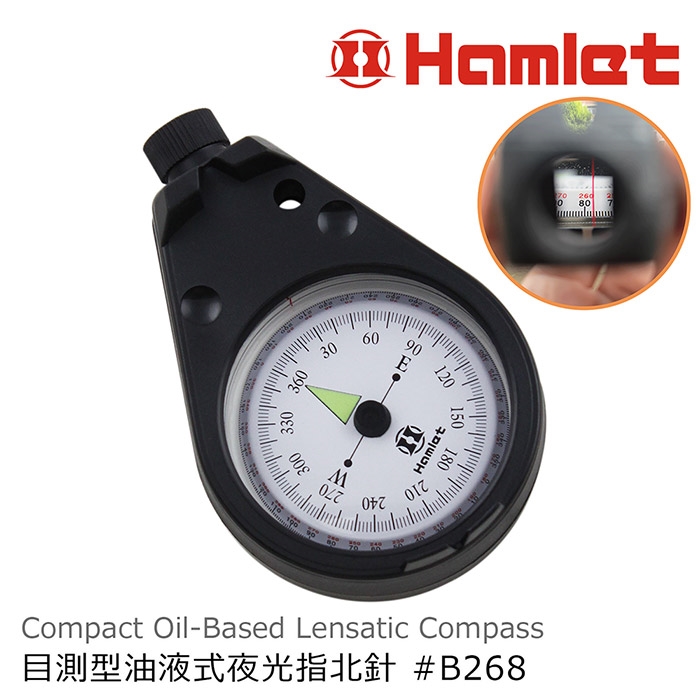 【B268】屬於民用之簡易型瞻孔式指北針,輕量化塑膠機身,羽量30g,輕巧方便攜帶;指北轉盤填充油液,提供穩定的方向指引,指北轉盤內圈為360度方位角,最小單位為2度,透過4倍的放大鏡的目測孔觀察可精準判讀轉盤外圈,使觀察遠方時更準確,外圈黑字對應內圈讀數。具備照門 (瞄準器/準星) 功能,可確保操作時的水平與對準目標觀測物。指北N極具有螢光塗料,可於低光照、夜間導航使用。