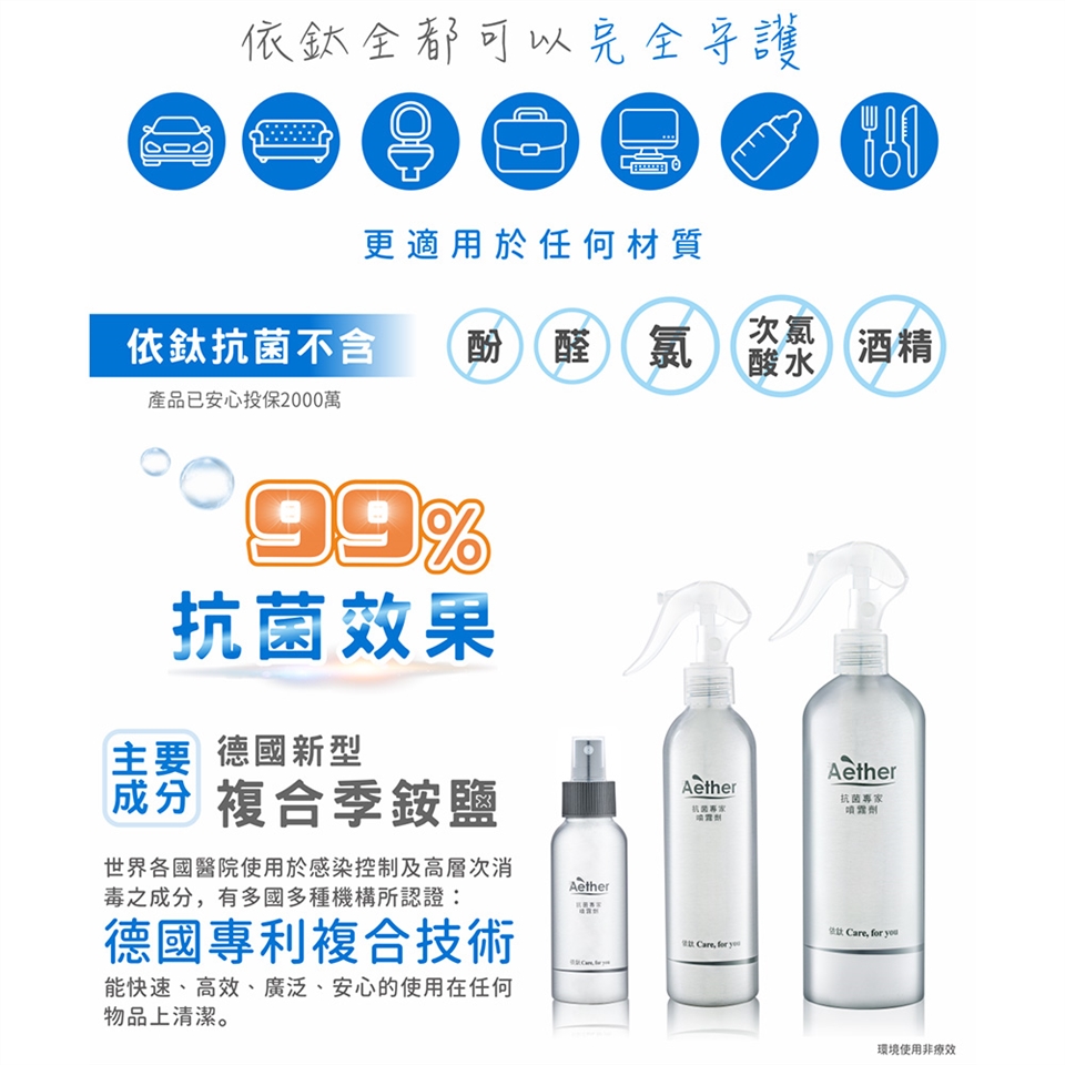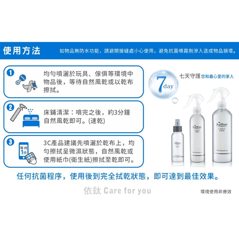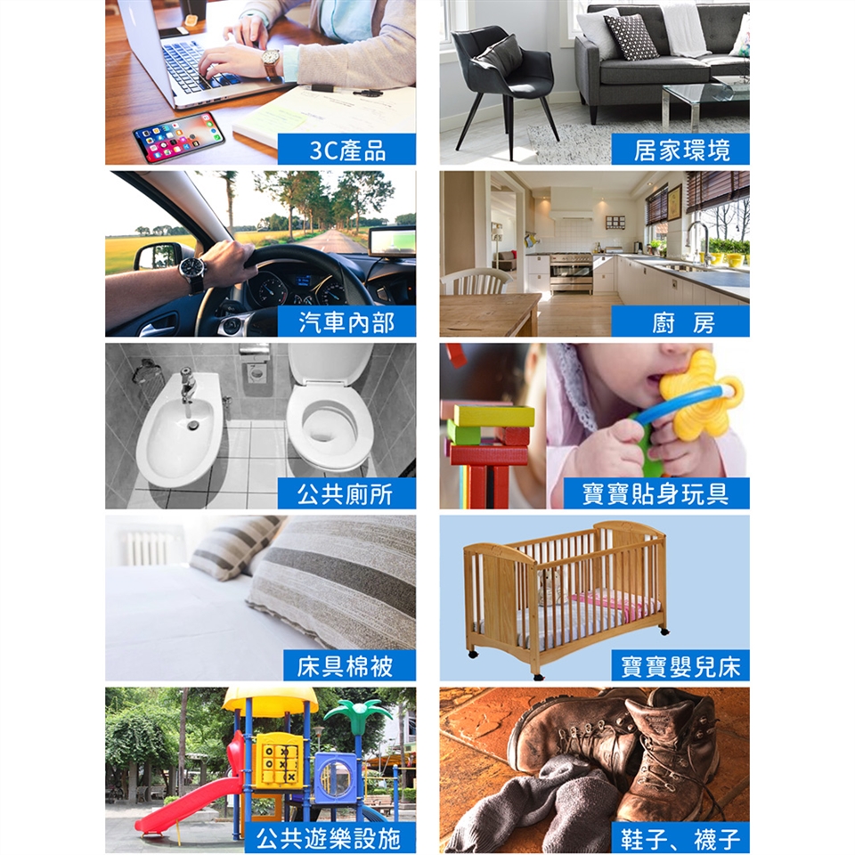 均勻噴灑於欲清潔(抗菌)的物品表面,靜置後擦拭乾淨